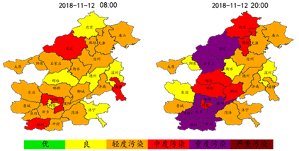 11月12日起,京津冀及周边地区和汾渭平原气象条件逐渐转差,污染物缓慢累积。12日0时,安阳市PM2.5浓度首先达到小时重度污染,随后郑州、新乡、邢台等多个城市的PM2.5浓度达到小时重度污染,并逐渐向北发展。截止12日22时,区域内PM2.5小时浓度最高值为206微克/立方米,出现在开封(12日19时)。北京市PM2.5小时浓度最高值达150微克/立方米(12日21时)。