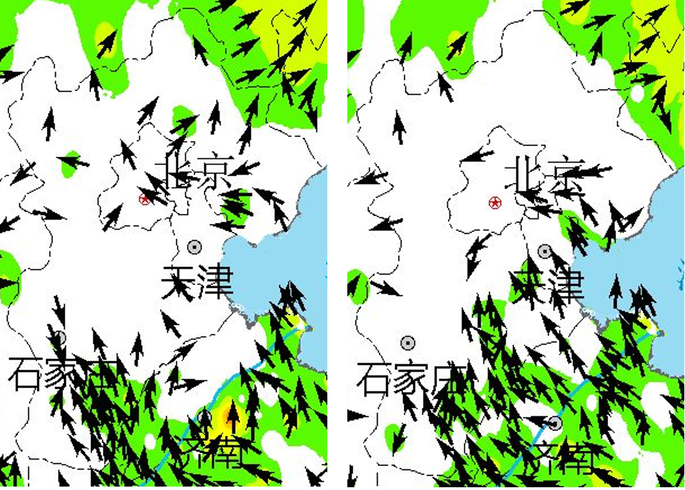 3月25日0时(左)和8时(右)京津冀区域风场实况