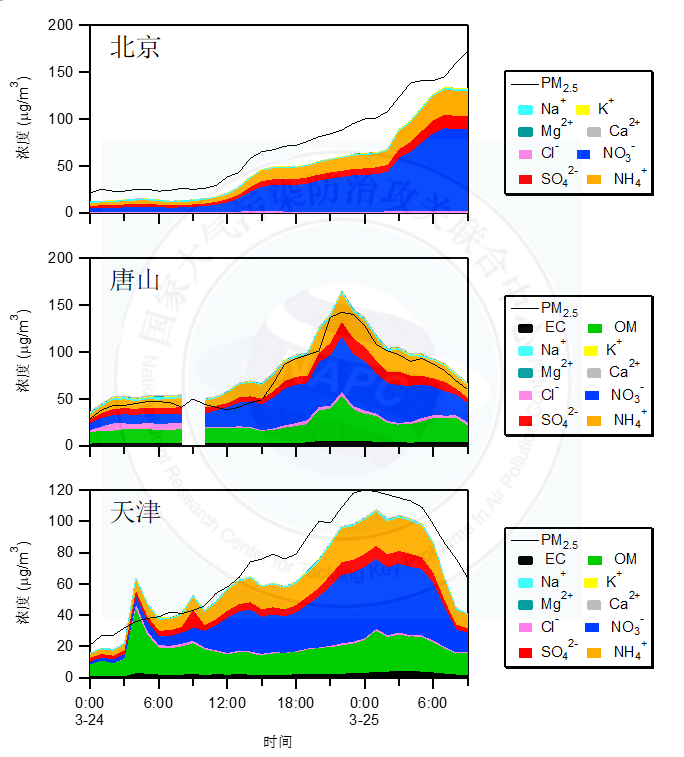 3月24–25日京津冀区域典型城市PM2.5组分浓度变化