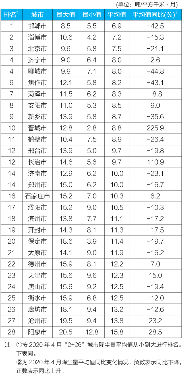 2020年4月京津冀大气污染传输通道“2+26”城市降尘监测结果