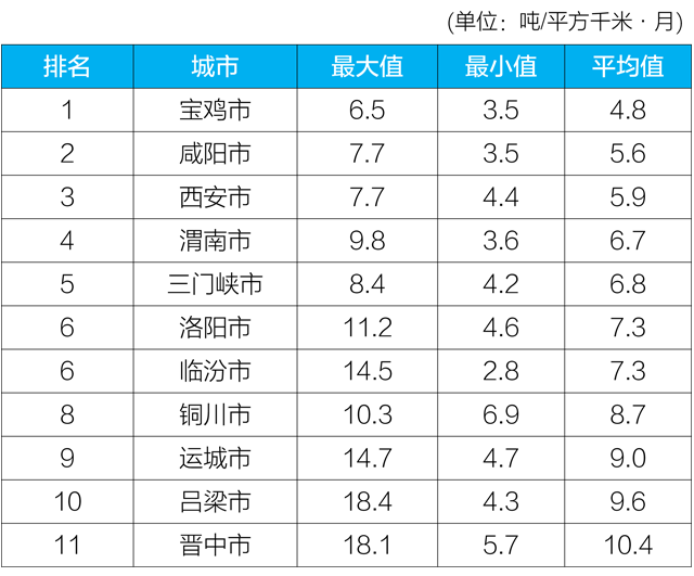 2020年4月汾渭平原11城市降尘监测结果