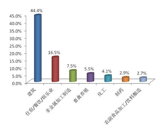 从行业类型来看,4月公众反映最集中的行业为建筑业,占44.4%,其次为住宿餐饮娱乐业和非金属加工制造业,分别占16.5%和7.5%。其中,建筑业举报占比环比下降0.8个百分点,住宿餐饮娱乐业、非金属加工制造业占比环比分别上升4.0个百分点和1.4个百分点,畜禽养殖业占比环比下降2.8个百分点。