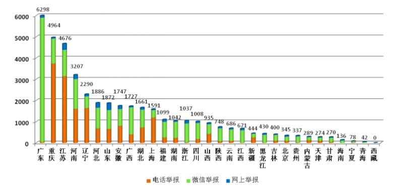 从各地区不同渠道举报数量看,广东、重庆、江苏、河南等地举报总量居前,重庆、上海等地电话举报占比较高,广东、浙江、江西、黑龙江等地微信举报占比较高。