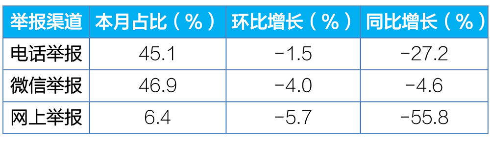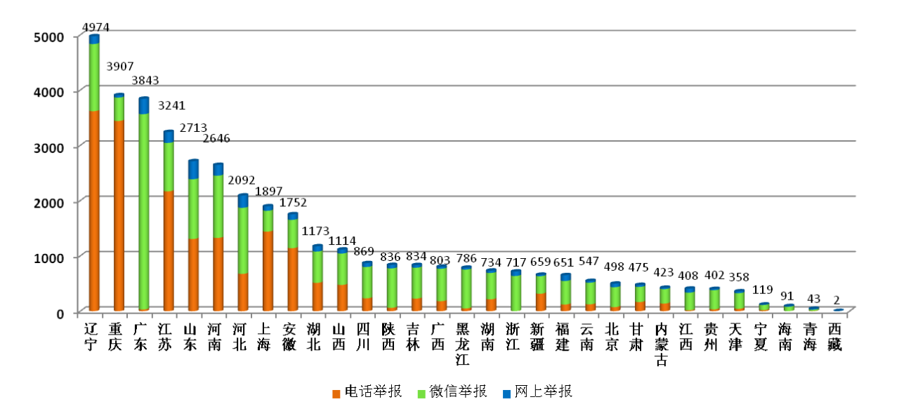 从各地区不同渠道举报数量看,辽宁、重庆、广东等地举报总量居前,辽宁、重庆、上海等地电话举报占比较高,广东、陕西、浙江等地微信举报占比较高。