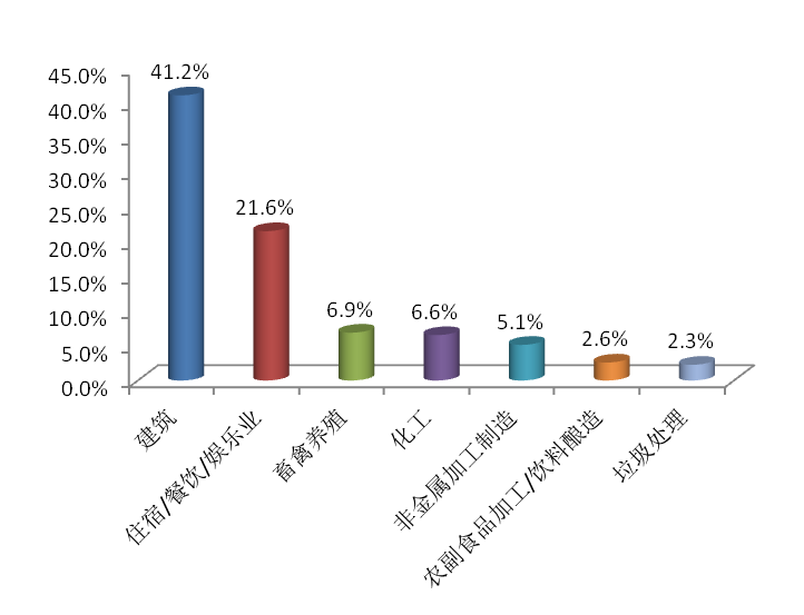 从行业类型来看,7月公众反映最集中的行业为建筑业,占41.2%,其次为住宿餐饮娱乐业和畜禽养殖业,分别占21.6%和6.9%。其中,建筑业、住宿餐饮娱乐业举报占比环比分别上升0.8个百分点和1.1个百分点,畜禽养殖业举报占比环比下降0.2个百分点。