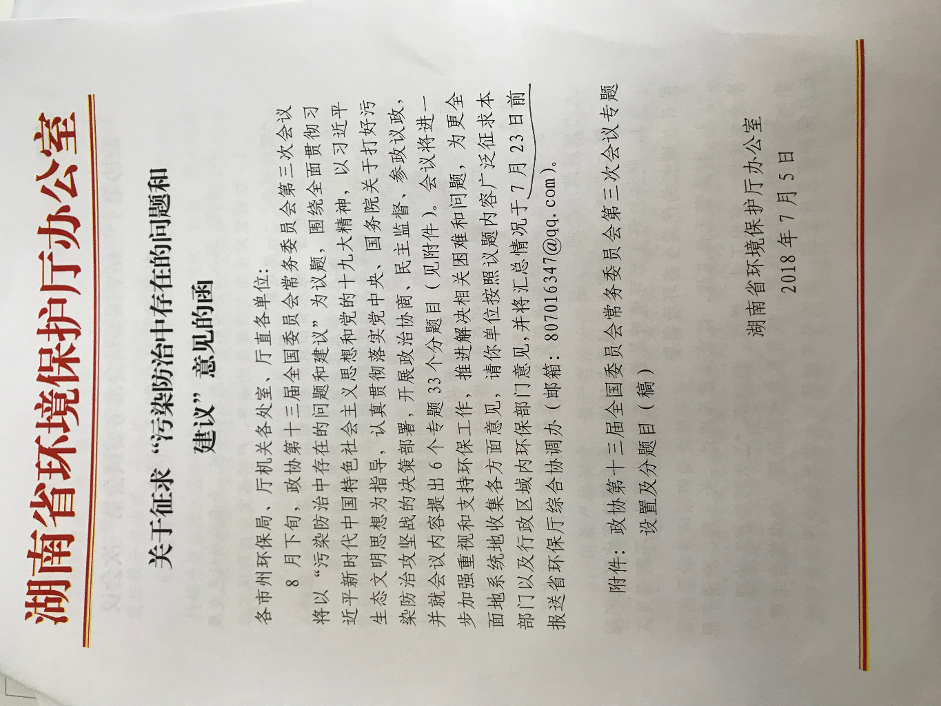 关于征求“污染防治中存在的问题和建议”意见的函
