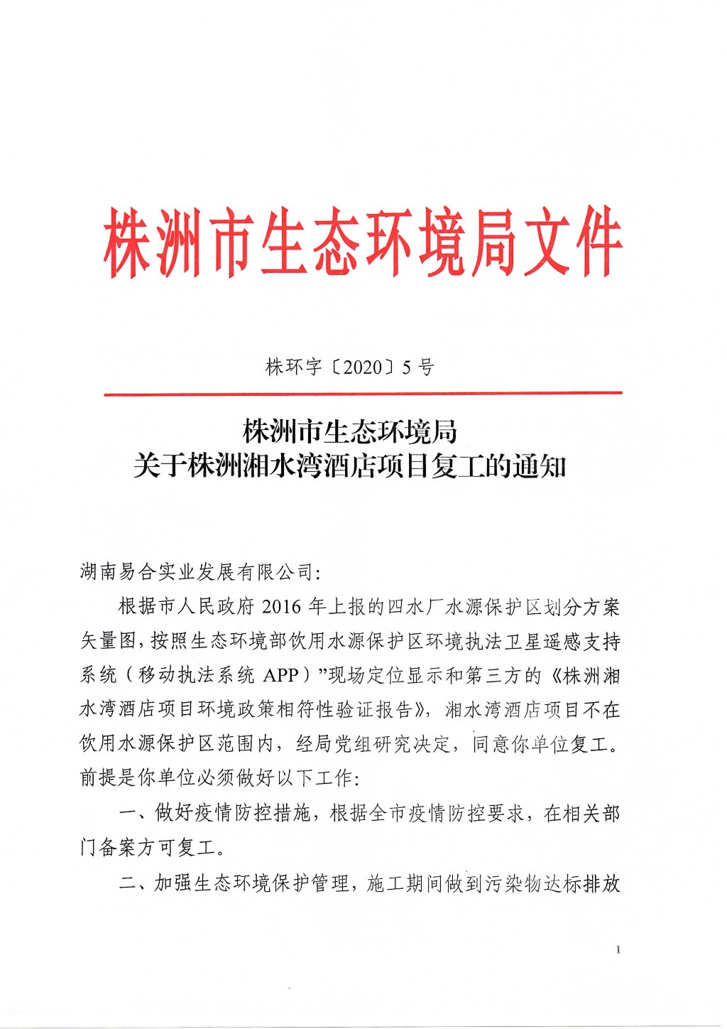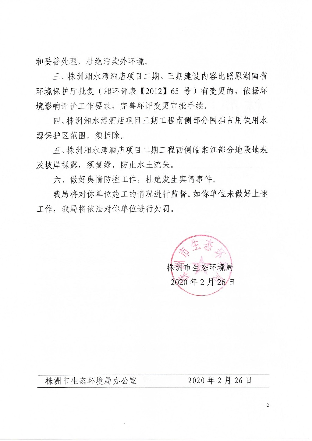 株洲市生态环境局关于株洲湘水湾酒店项目复工的通知