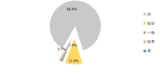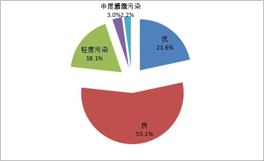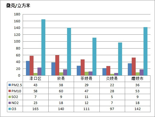 与上年比较,两项污染物浓度下降,为:SO2下降5微克/立方米,下降比例为31.2%;PM10下降1微克/立方米,下降比例为1.5%;三项污染物浓度上升,为:PM2.5上升5微克/立方米,上升比例为11.9%; NO2上升3微克/立方米,上升比例为9.7%;臭氧上升27微克/立方米,上升比例为20.0%;一氧化碳浓度保持不变。