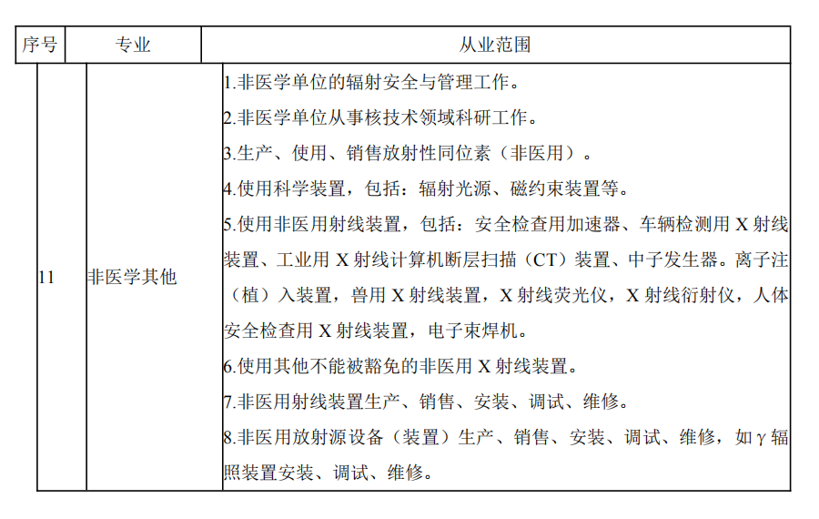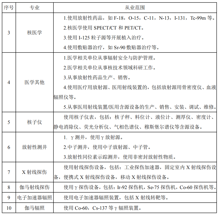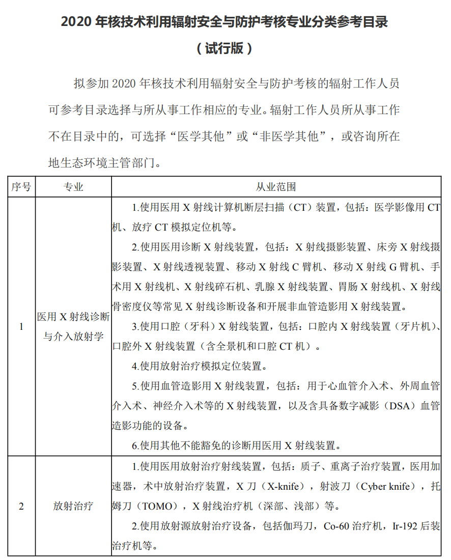 2020年核技术利用辐射安全与防护考核专业分类参考目录(试行版)