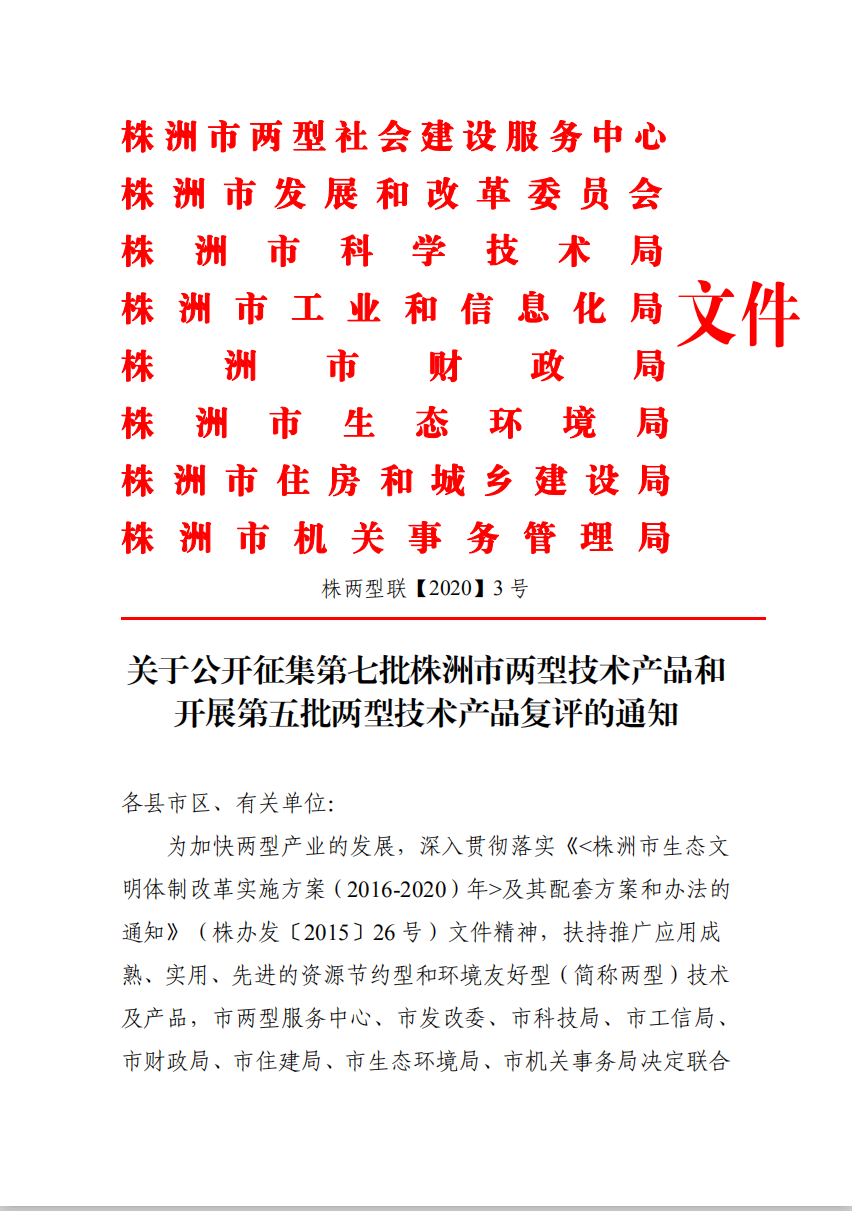 关于公开征集第七批株洲市两型技术产品和 开展第五批两型技术产品复评的通知