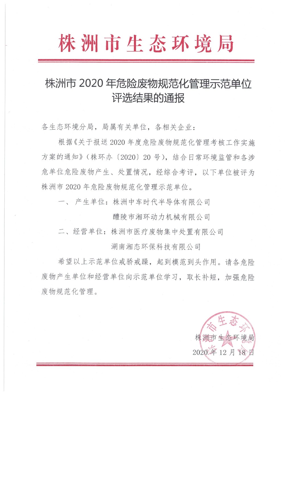 2020年株洲市危险废物规范化管理结果的通报