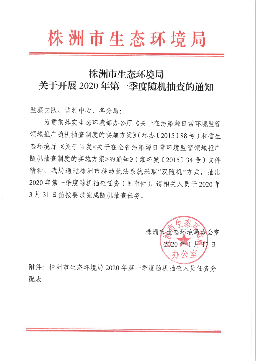 株洲市生态环境局关于开展2020年第一季度随机抽查的通知