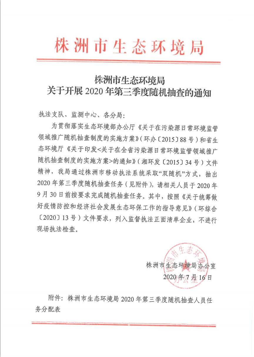 株洲市生态环境局关于开展2020年第三季度随机抽查的通知