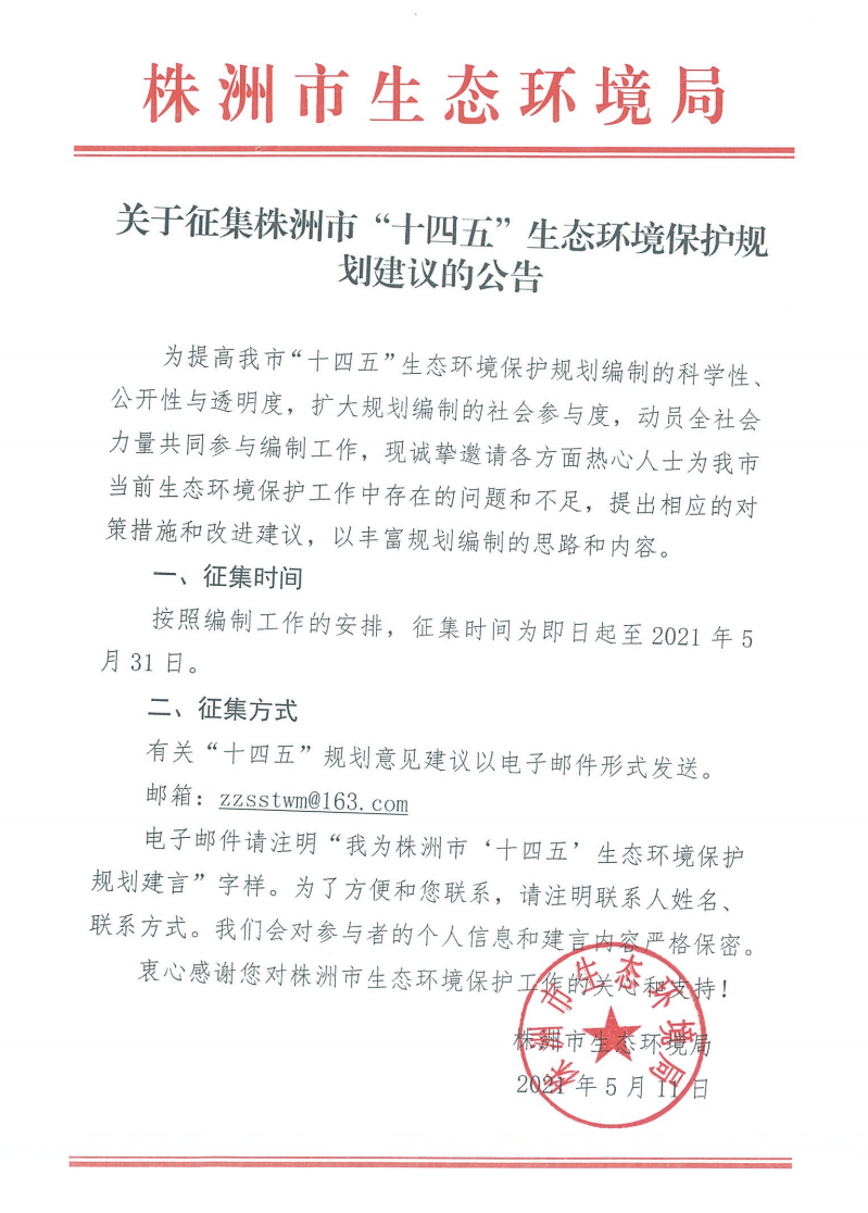 关于征集株洲市“十四五”生态环境保护规划建议的公告