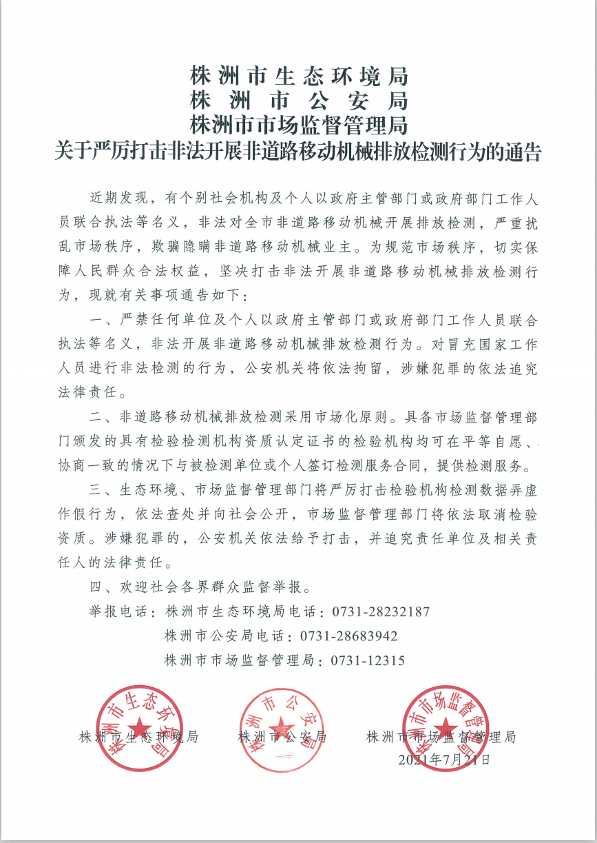 关于严厉打击非法开展非道路移动机械排放检测行为的通告