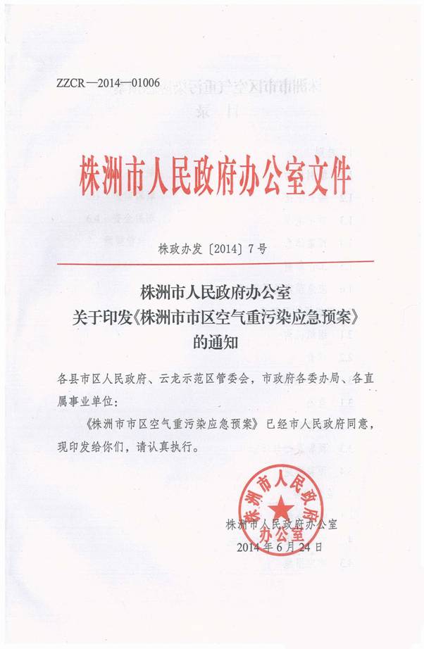 株洲市人民政府办公室关于印发《株洲市市区空气重污染应急预案》的通知