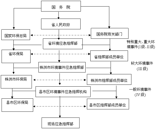 株洲市突发环境事件应急预案 目 录 1. 总则 1.1 目的 1.2 编制依据 1.3 适用范围 1.4 工作原则 2.应急指挥体系 2.1 应急组织机构 2.2 应急组织机构职责 2.3 组织体系框架图 3.预防预警机制 3.1 预防预警信息 3.2 预防预警行动 3.3 预警支持系统 3.4 预警级别与发布 4.应急响应 4.1 应急响应分级 4.2 应急响应行动 4.3 信息报送与处理 4.4 指挥和协调 4.5 应急处置 4.6 应急人员及群众安全防护 4.7 信息发布 4.8 应急结束 5.善后工作 5.1 善后处置 5.2 社会救助 5.3 分析评估 6.应急保障 6.1 通信保障 6.2 装备保障 6.3 人力资源保障 6.4 技术保障 6.5 经费保障 7.监督管理 7.1 宣传、培训和演练 7.2 奖励与责任 7.3 监督检查 8.附则 8.1 名词术语解释 8.2 预案管理与更新 8.3 预案解释部门 8.4 预案实施时间 1. 总则 1.1 编制目的 为了有效预防、及时控制、消除环境事件的危害和损失,保障公众生命安全、财产安全和环境安全,维护社会稳定,促进经济社会协调、健康发展。 1.2 编制依据 《中华人民共和国突发事件应对法》、《中华人民共和国环境保护法》、《中华人民共和国安全生产法》、《国家突发环境事件应急预案》、《湖南省突发环境事件应急预案》和《株洲市突发公共事件总体应急预案》等法律法规和有关规定。 1.3 适用范围 本预案适用于本行政区域突发环境事件的防范和应急处置。 1.4 工作原则 (1)坚持以人为本,预防为主。加强对环境安全隐患的监测、监控并实施监督管理,建立突发环境事件风险防范体系,提高突发环境事件应急处置能力,避免或减少突发环境事件的发生,消除或减轻突发环境事件所造成的影响。 (2)坚持统一领导,分级响应。突发环境事件应急处置工作实行在各级人民政府统一领导下,部门配合、上下联动的应急工作机制,属地为主,分级响应。 (3)坚持分类管理,科学处置。针对不同污染源所造成的环境污染、生态污染、放射性污染等特点,实行分类管理,充分发挥部门专业优势实施应急处置,使采取的措施与突发环境事件造成的危害和社会影响相适应。 (4)坚持平战结合,专兼结合。利用现有资源,积极做好应对突发环境事件的各项准备,加强培训演练,充分发挥现有专业及社会环境应急救援力量的作用。 2.应急指挥体系 市、县市区人民政府设立环境事件应急指挥机构,负责本行政区域环境事件的应对工作。 2.1 应急组织机构 市人民政府设立株洲市突发环境事件应急指挥部(以下简称市环境应急指挥部),由市人民政府分管副市长任指挥长,市人民政府协管副秘书长、市军分区参谋长、市武警支队支队长、市环保局局长、市公安局分管副局长任副指挥长,市发改委、市安监局、市企业发展促进局、市民政局、市交通局、市建设局、市卫生局、市水利局、市林业局、市气象局、市财政局、市消防支队、市政府新闻办、中国电信株洲分公司、湖南移动株洲分公司、中国联通株洲分公司等单位负责人为指挥部成员。 市环境应急指挥部办公室设在市环保局,由市环保局局长兼任办公室主任。 2.2 应急组织机构职责 2.2.1 市环境应急指挥部 贯彻国家、省、市有关环境应急工作的方针、政策;统一指挥、协调、指导全市突发环境事件的应对工作,决定全市突发环境事件应急处置重大问题;建立健全环境应急机制,组织制定突发环境事件应急预案;负责环境应急宣教工作,统一发布环境事件有关信息;承担国家、省环保部门和市人民政府交办的其他工作。 2.2.2 市环境应急指挥部办公室 组织协调突发环境事件应对工作,制定有关突发环境事件应急处置措施;建立和完善突发环境事件的预警预测及监测系统;开展应急处置和现场监测的人员培训,组织预案演练活动;承担市环境应急指挥部交办的其他工作。 2.2.3 市环境应急指挥部成员单位 市环保局 建立健全反应快速、保障协调的应急机制;参与突发环境事件应急处置组织、智慧和协调工作;提供应急处置现场污染物分析监测、放射源处置的技术支持。 市军分区、市武警支队 组织驻株部队、武警和民兵、预备役部队参加救援、抢险和警戒等工作。 市公安局 组织协调道路交通安全事故、恐怖事件等引起的环境事件现场处置工作;对突发环境事件应急处置中的重要目标和危险区域实施治安、警戒和交通道路管制。 市消防支队 组织协调火灾事故引起的环境事件现场处置工作,负责对事故现场的火灾灭火与泄漏控制,或可能导致火灾或泄漏的隐患处置。 市安监局 配合拟制因危险化学品安全事故引发的环境污染应急处置预案,参与较大突发环境事件应急处置。 市发改委 负责将全市环境应急救援体系建设纳入市国民经济与社会发展规划。 市企业发展促进局 负责突发环境事件应急处置中电力保障有关协调工作。 市民政局 储备、管理和调配救济物资,负责受害群众的生活救济。 市交通局 组织协调船舶、港口污染事件的应急处置工作,参与因道路交通事故引发的环境事件应急处置。 市建设局 负责受突发环境事件影响的供水水源安全工作。 市卫生局 负责突发环境事件中受伤、中毒人员医疗救治,组织协调卫生防疫工作,为事发地医疗机构提供技术支持。 市水利局 配合拟制市重点流域突发环境事件应急预案,参与市重点流域水环境事件应急处置工作。 市林业局 负责对珍稀濒危物种栖息地遭受污染威胁的物种保护工