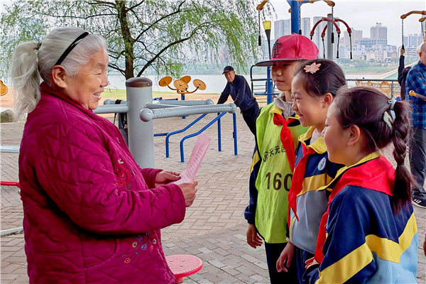 学生们给市民发倡议书。