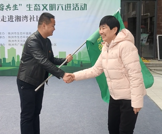 ▲市生态环境局二级调研员李文英授旗给天元区栗雨街道湘湾社区