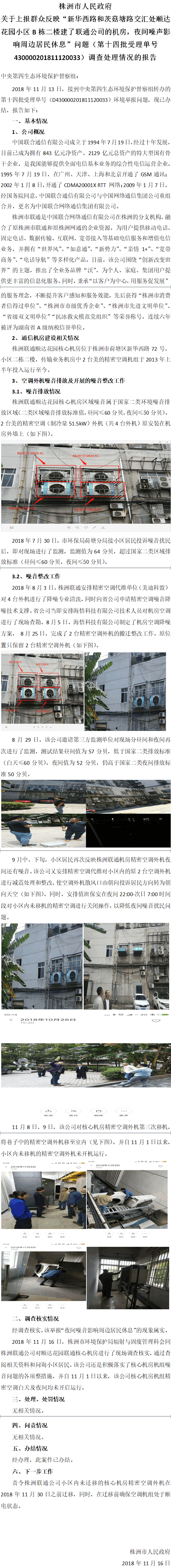 株洲市人民政府关于上报群众反映“新华西路和茨菇塘路交汇处顺达花园小区B栋二楼建了联通公司的机房,夜间噪声影响周边居民休息”问题(第十四批受理单号430000201811120033)调查处理情况的报告