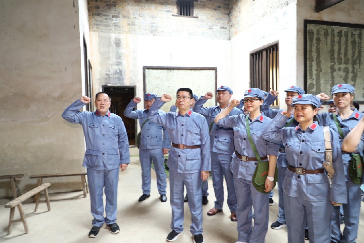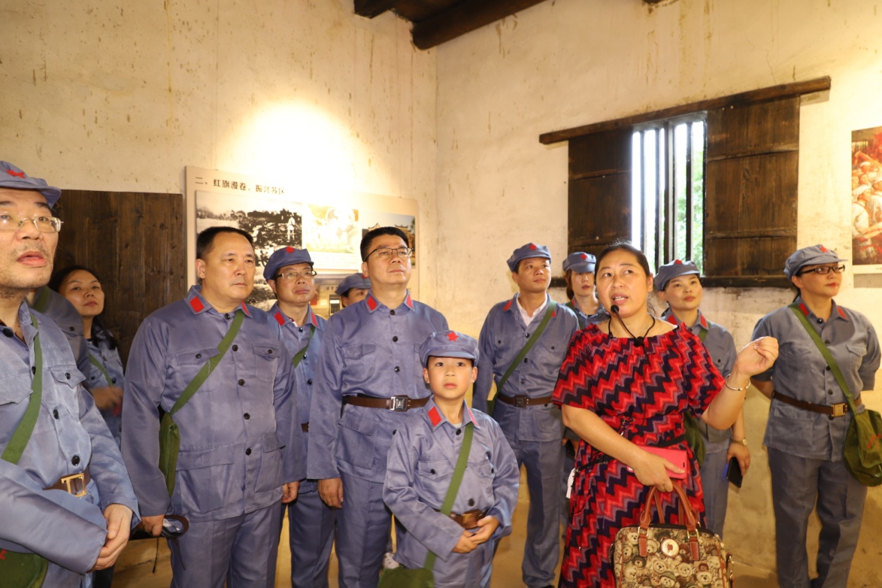 来到湾里村,党员们兴奋的换上红军服,变身 "红军",依次参观红军广场、苏维埃时期的门牌、地图、宣传画、标语等革命遗迹。回顾当年红军在广场操练的一幕幕情景,走过劳动部、财政部、军事部、文化部等有些幽暗的办公室,瞻仰萧克、张云逸、谭家述、谭余保等红军将领的英武形象,目睹一件件尘封久远的物件,聆听讲解员述说的一个个与国民党反动派浴血奋战的感人故事,党员们心中多了一份感恩、沉重、责任!