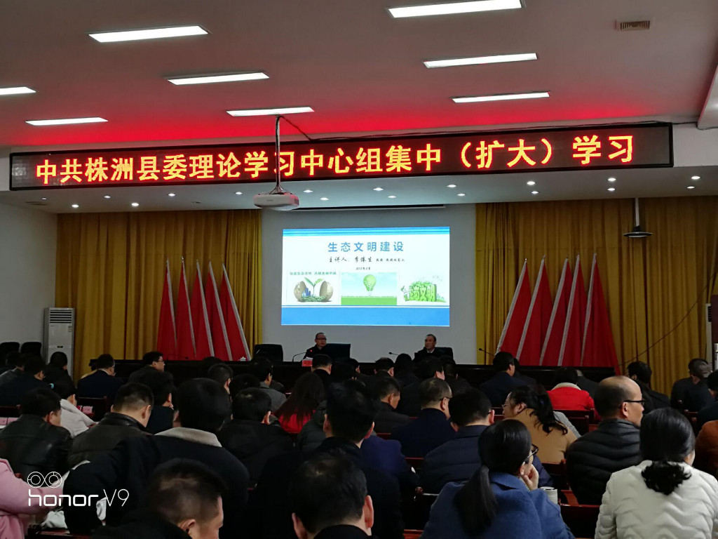 正月初七,春意正浓,年味未尽。上午9:30,中共株洲县委理论学习中心组组织学习十九大报告中关于生态文明建设内容。 李倦生教授就十九大报告中关于环境保护的内容,生态文明建设的内涵和重大意义,生态文明建设的必要性,如何建设生态文明以及未来环境保护所面临的巨大压力这6个方面对生态文明建设进行了深入简出的讲述。 通过学习,株洲县领导干部对生态文明建设要做什么、怎么做、如何做好有了客观直接的了解,同时也对我县生态文明建设的开展奠定了良好的基础。(株洲县环保局)