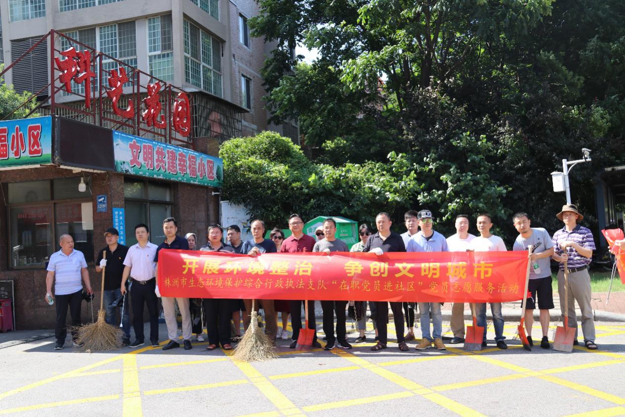 为隆重庆祝中国共产党成立99周年,重温党的光辉历史,发扬党的光荣传统,进一步发挥党建引领作用。2020年6月17日下午,株洲市生态环境局监察支队全体党员来到天元区湘紫社区科艺花园小区,开展"在职党员进社区"志愿服务活动。