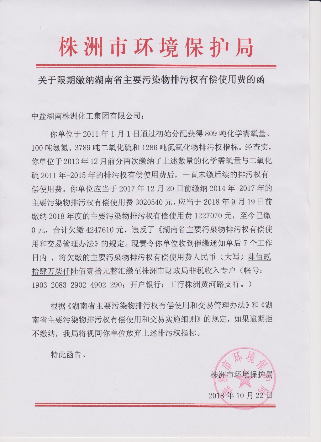 你单位于2011年1月1日通过初始分配获得809吨化学需氧量、100吨氨氮、3789吨二氧化硫和1286吨氮氧化物排污权指标。经查实,你单位于2013年12月前分两次缴纳了上述数量的化学需氧量与二氧化硫2011年-2015年的排污权有偿使用费后,一直未缴后续的排污权有偿使用费。你单位应当于2017年12月20日前缴纳2014年-2017年的主要污染物排污权有偿使用费3020540元,应当于2018年9月19日前缴纳2018年度的主要污染物排污权有偿使用费1227070元,至今已缴0元,合计欠缴4247610元,违反了《湖南省主要污染物排污权有偿使用和交易管理办法》的规定。现责令你单位收到催缴通知单后7个工作日内 ,将欠缴的主要污染物排污权有偿使用费人民币(大写)肆佰贰拾肆万柒仟陆佰壹拾元整汇缴至株洲市财政局非税收入专户(帐号:1903 2083 2902 4902 290;开户银行:工行株洲黄河路支行。)
